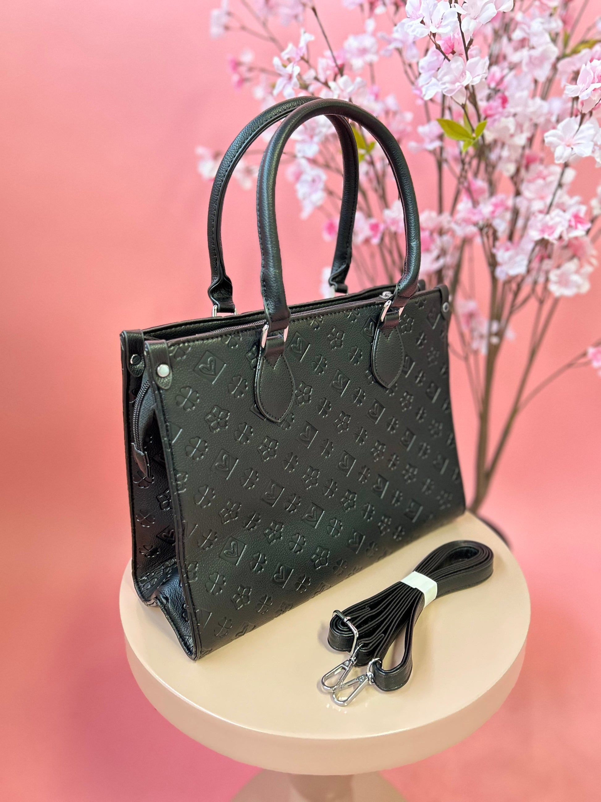 Het verfijnde design wordt gekenmerkt door een subtiel reliëfpatroon en zilverkleurige details, waardoor de tas een moderne en stijlvolle uitstraling heeft.