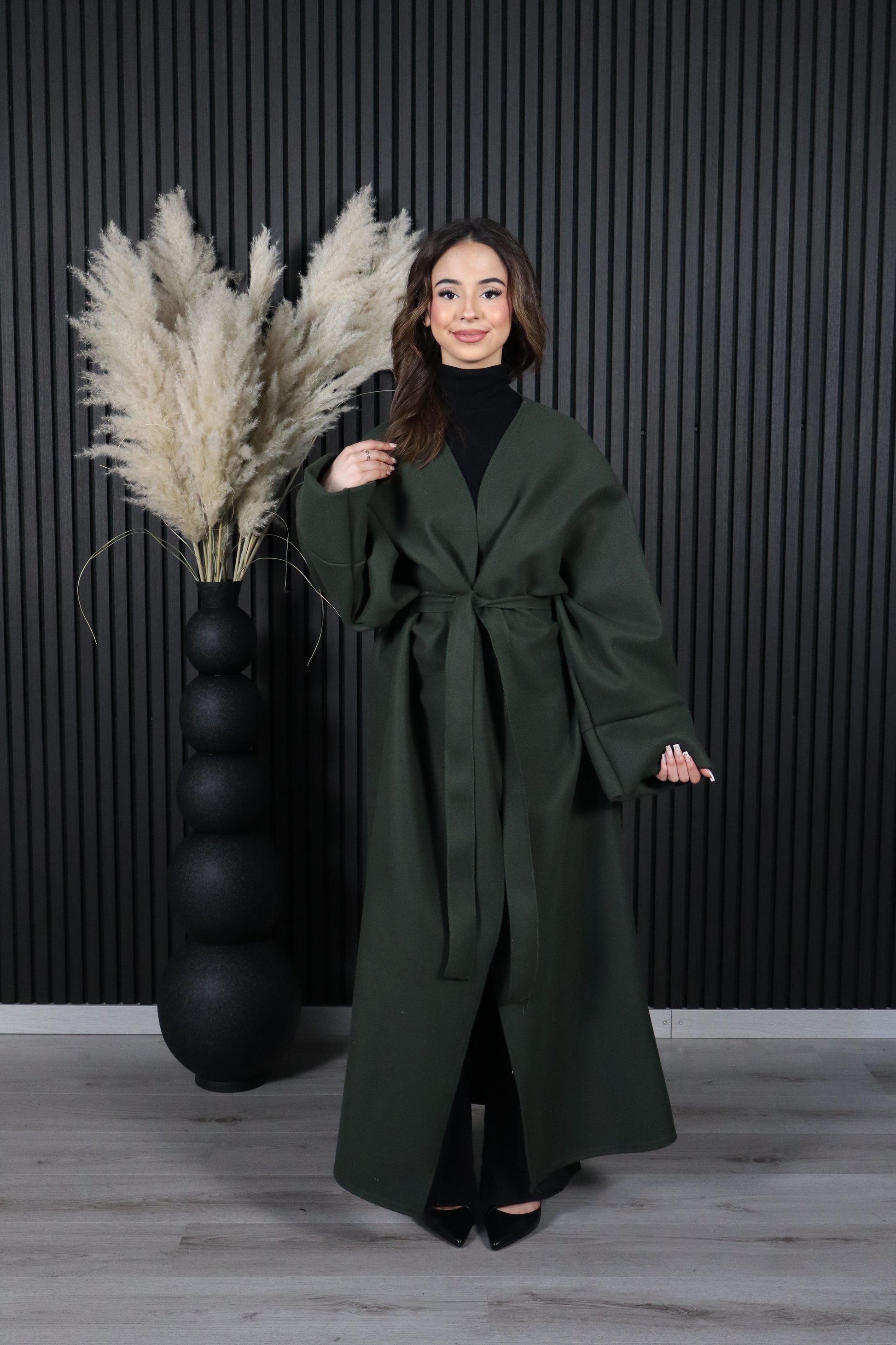 Deze stijlvolle jas is voorzien van speelse vlindermouwen en een centuur die de taille mooi accentueert.