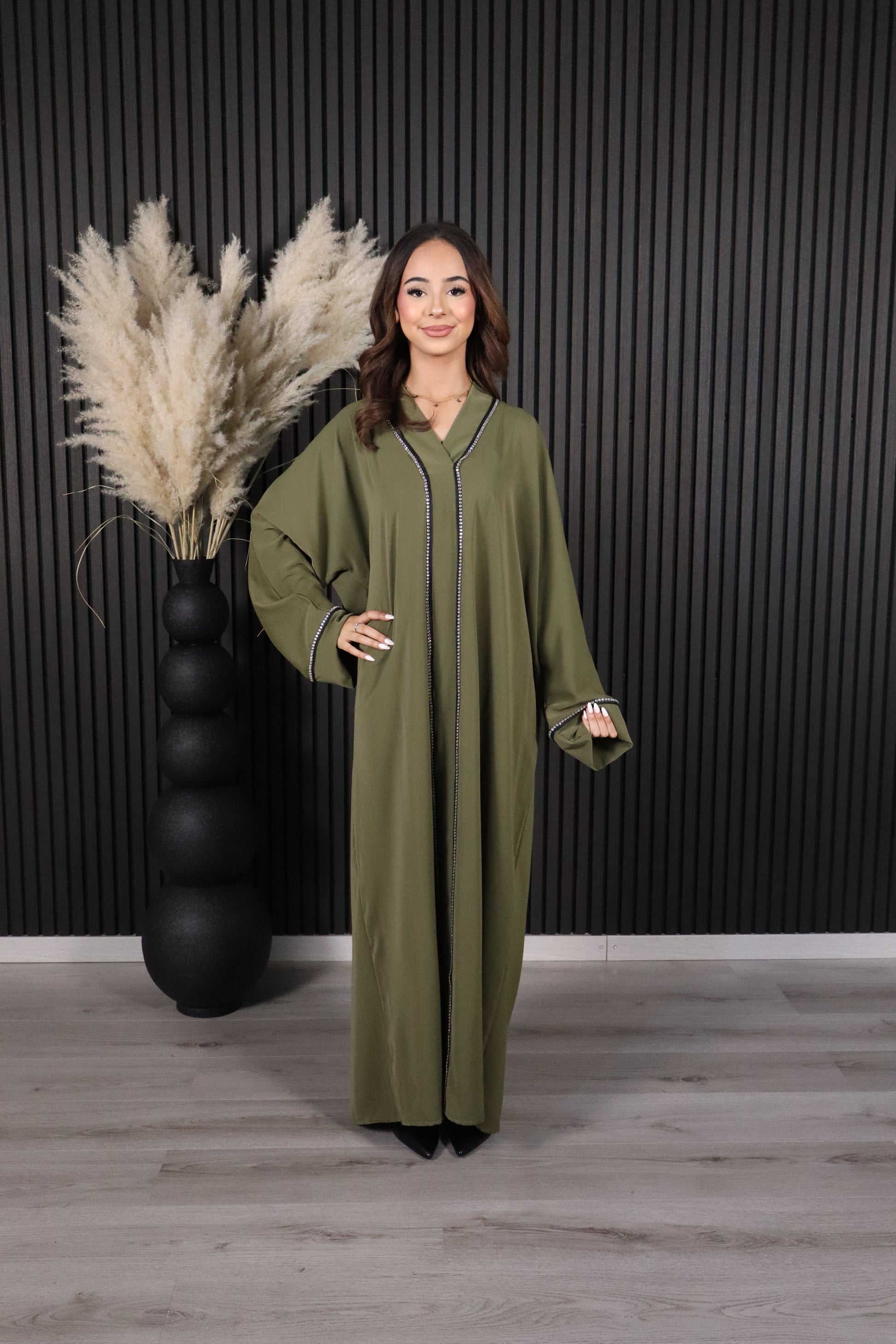 Deze prachtige kaftan is voorzien van subtiele strass steentjes op de voorkant en aan de onderkant van de mouwen, die zorgen voor een schitterende en feestelijke uitstraling.